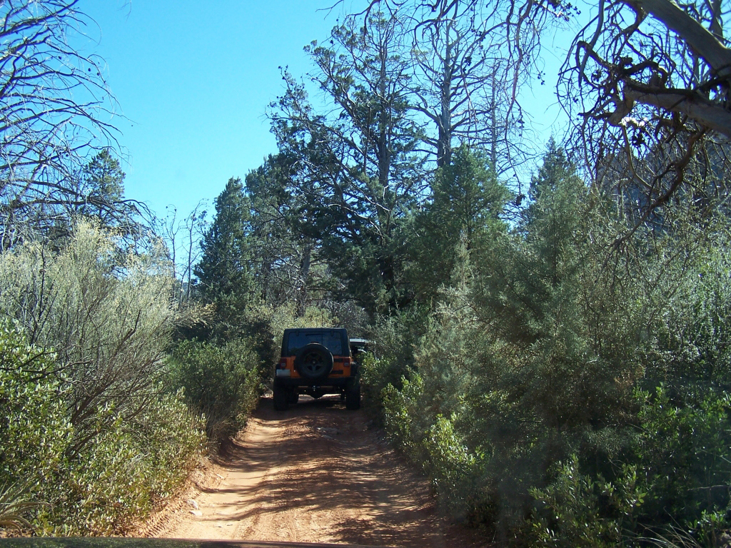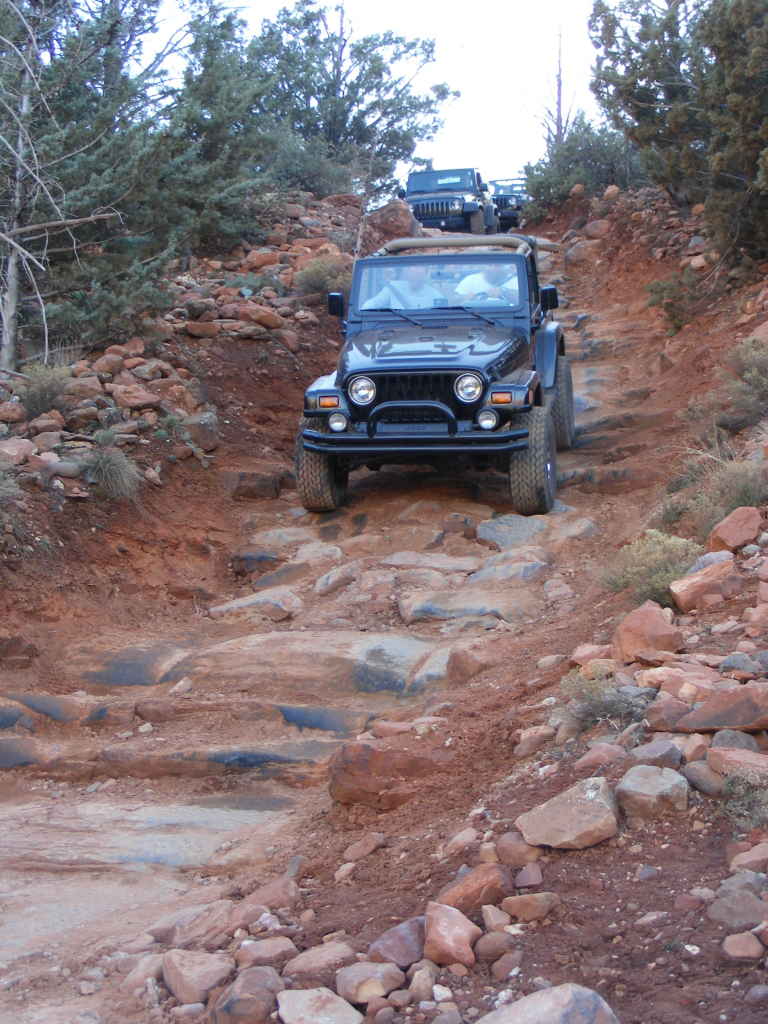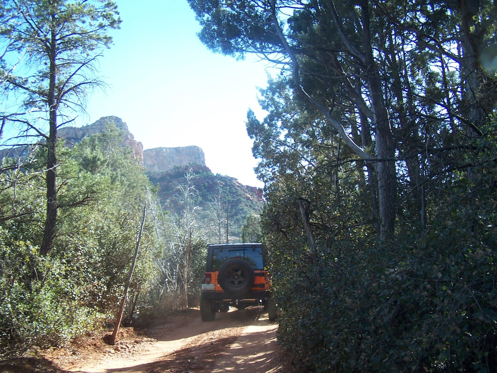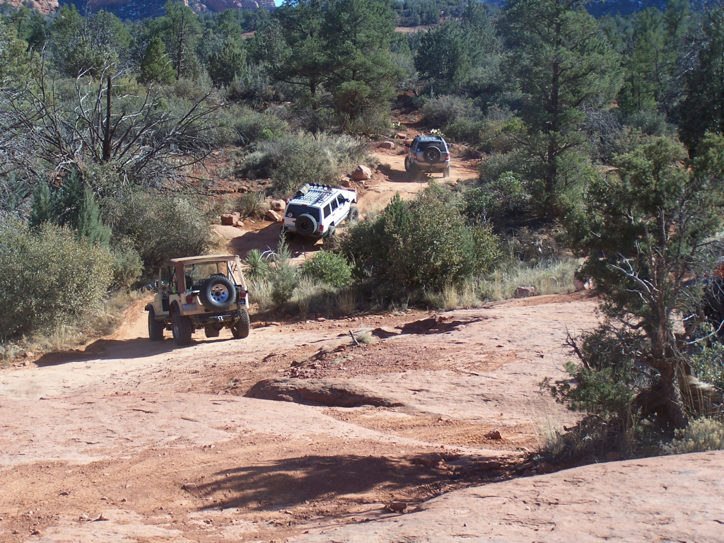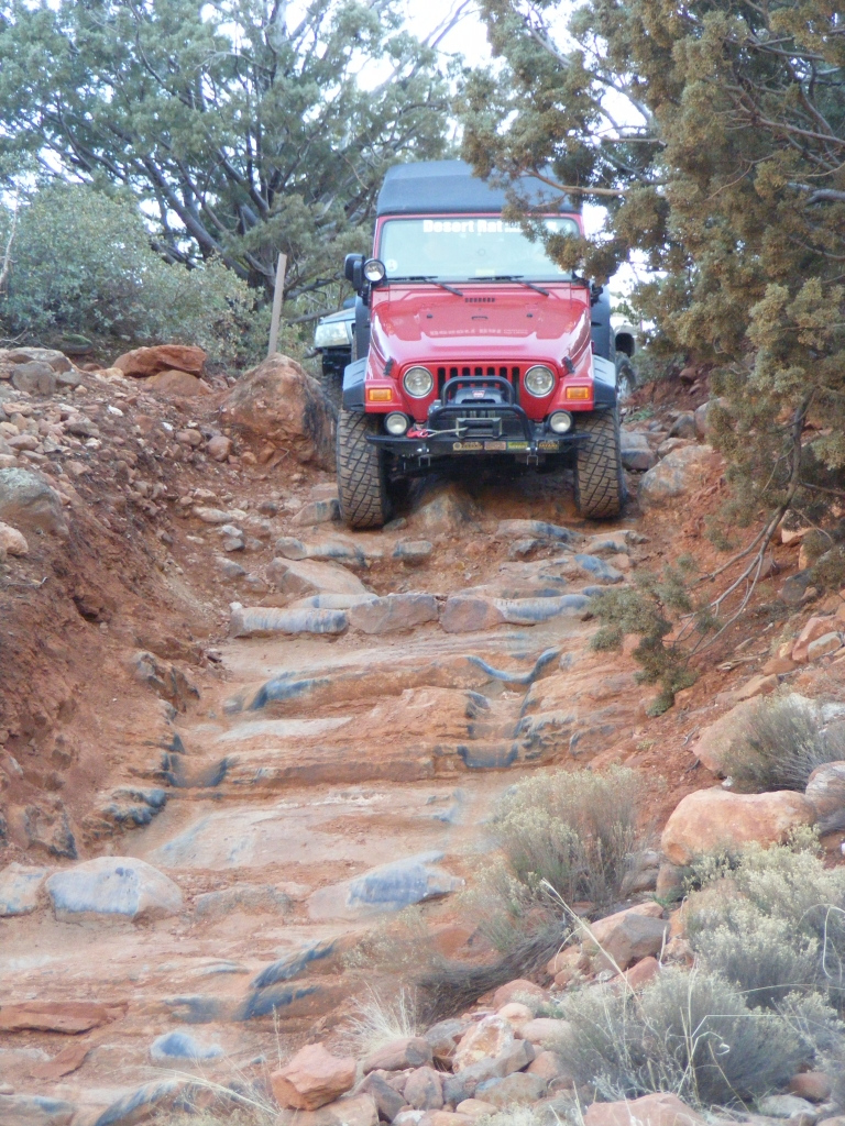 Description: Although fairly short, this trail has to be considered one of the best in Arizona. It is extremely fun to drive and the red rock scenery is knock-out beautiful. This is an extremely popular route and traffic can be very heavy at times. Pull-outs are provided. Most of the trail runs through forest and is very narrow. Do not widen the trail by trying to pull over anywhere other than the pull-outs. You may have to back up. Please follow the arrows clearly posted right before one-way sections of the trail. This is also a very popular hiking and mountain biking area, so be alert and courteous at all times. Several large rock ledges require high ground clearance but the obstacles are not overwhelming because little articulation is required. Less than a mile into the trail, right after a parking area, there is a “go-no-go” rock you have to climb. If you can’t make it, it means your vehicle has no business being on the trail. There are few optional fun obstacles on the way back – you can skip them if you’re not comfortable. The hardest obstacle is called “The Steps”, which is driven downhill (no bypass). This obstacle is very steep and will be intimidating to an inexperienced driver, however stock SUVs with high ground clearance should be able get down just fine. Just take it slow. You may scrape bottom so skid plates are recommended. This trail is very well marked and easy to follow.