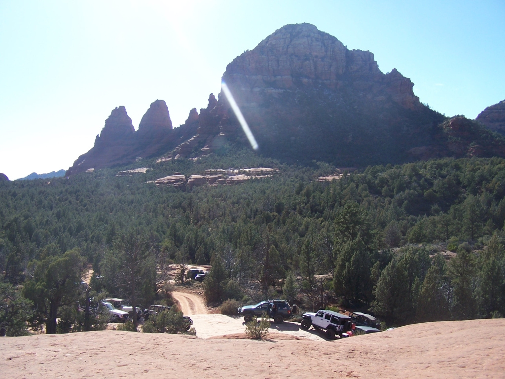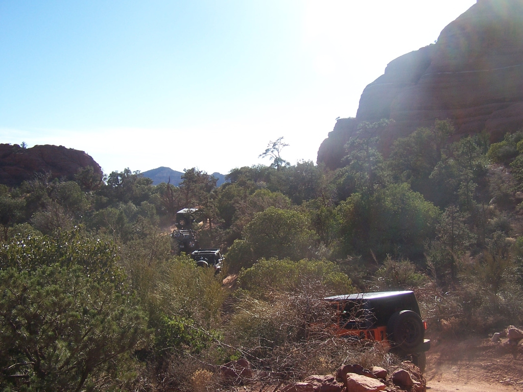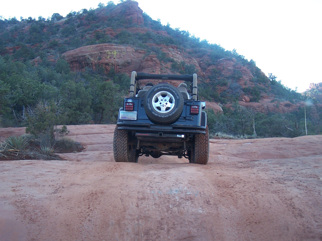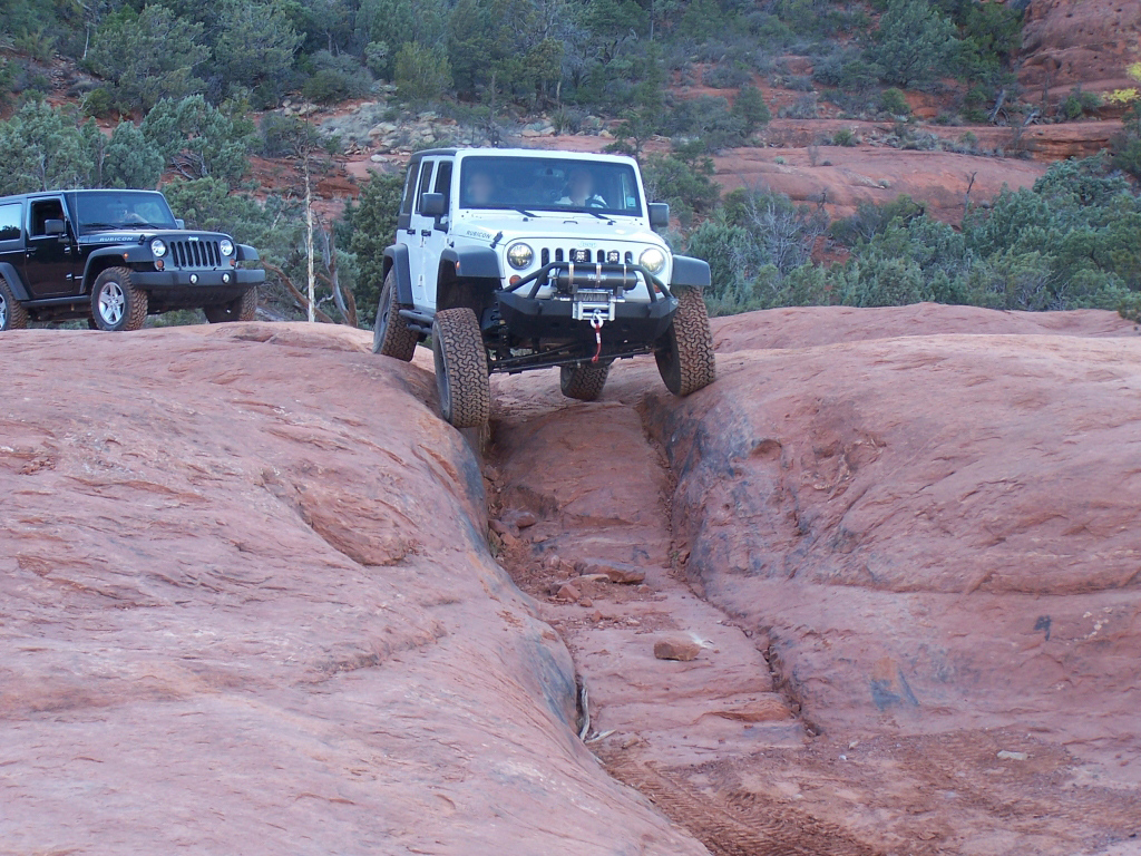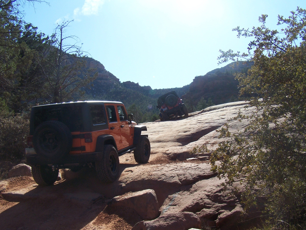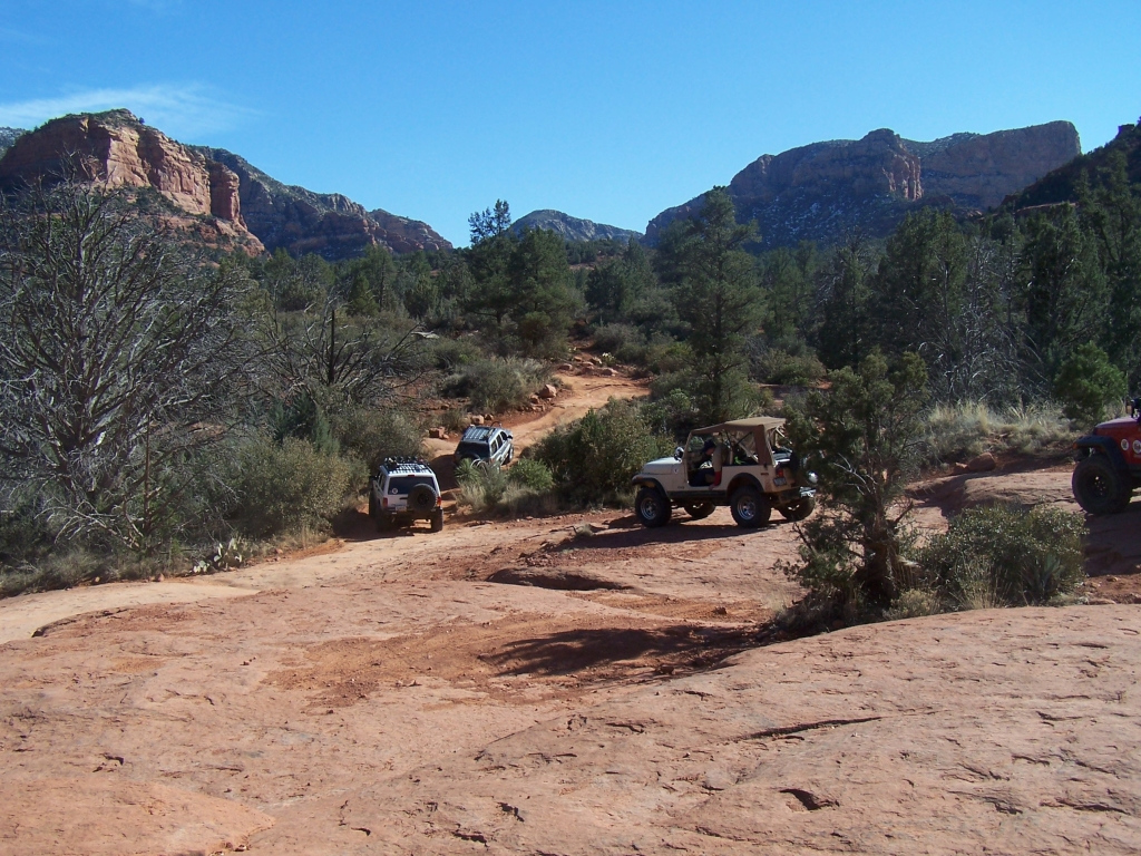 Description: Although fairly short, this trail has to be considered one of the best in Arizona. It is extremely fun to drive and the red rock scenery is knock-out beautiful. This is an extremely popular route and traffic can be very heavy at times. Pull-outs are provided. Most of the trail runs through forest and is very narrow. Do not widen the trail by trying to pull over anywhere other than the pull-outs. You may have to back up. Please follow the arrows clearly posted right before one-way sections of the trail. This is also a very popular hiking and mountain biking area, so be alert and courteous at all times. Several large rock ledges require high ground clearance but the obstacles are not overwhelming because little articulation is required. Less than a mile into the trail, right after a parking area, there is a “go-no-go” rock you have to climb. If you can’t make it, it means your vehicle has no business being on the trail. There are few optional fun obstacles on the way back – you can skip them if you’re not comfortable. The hardest obstacle is called “The Steps”, which is driven downhill (no bypass). This obstacle is very steep and will be intimidating to an inexperienced driver, however stock SUVs with high ground clearance should be able get down just fine. Just take it slow. You may scrape bottom so skid plates are recommended. This trail is very well marked and easy to follow.