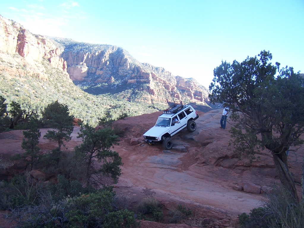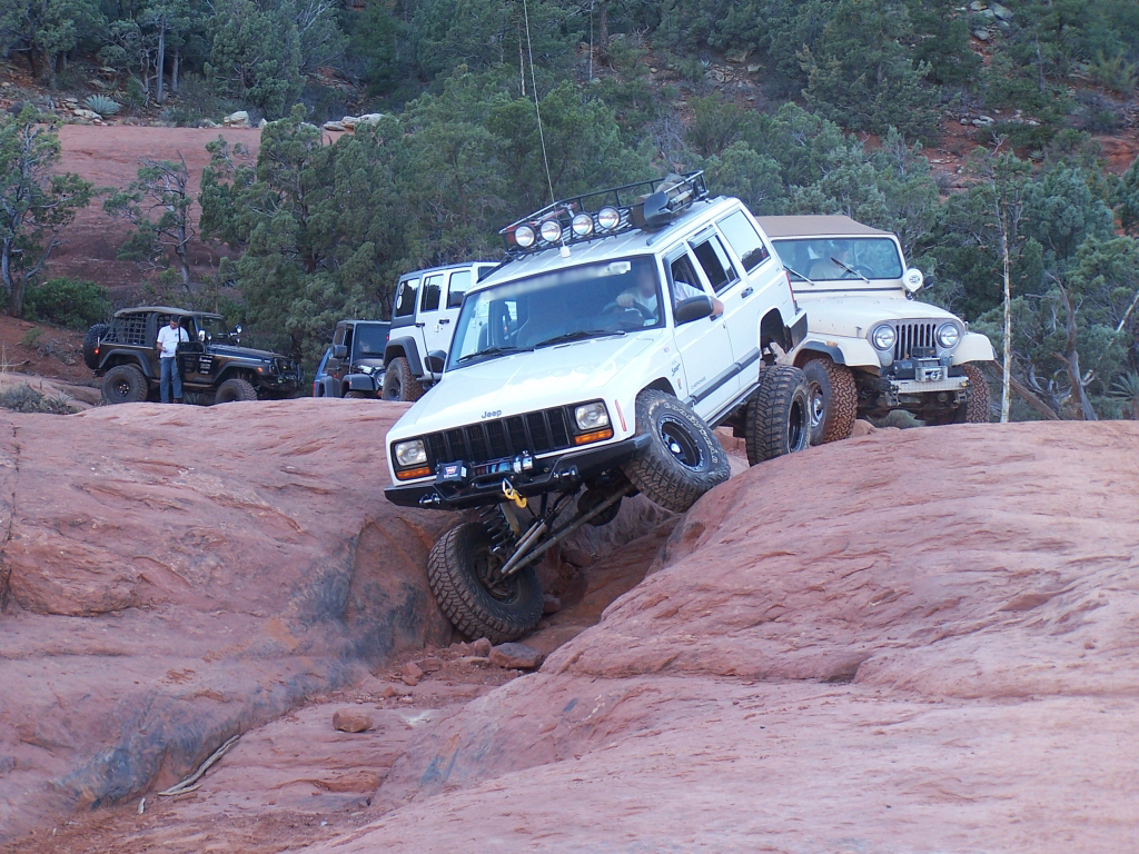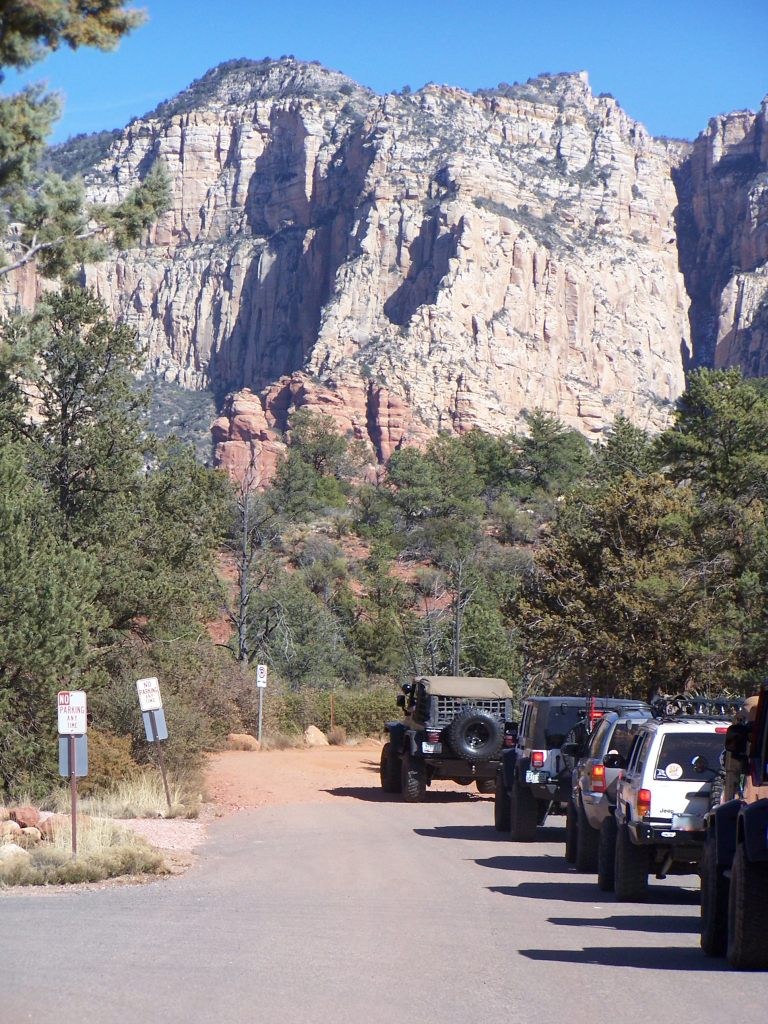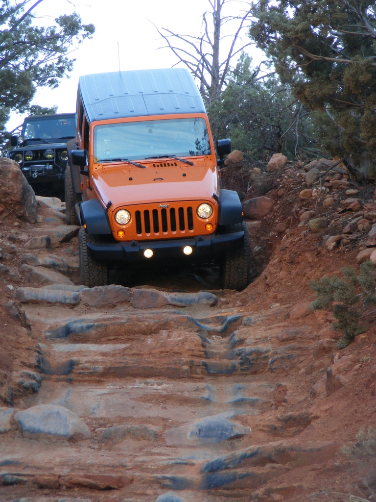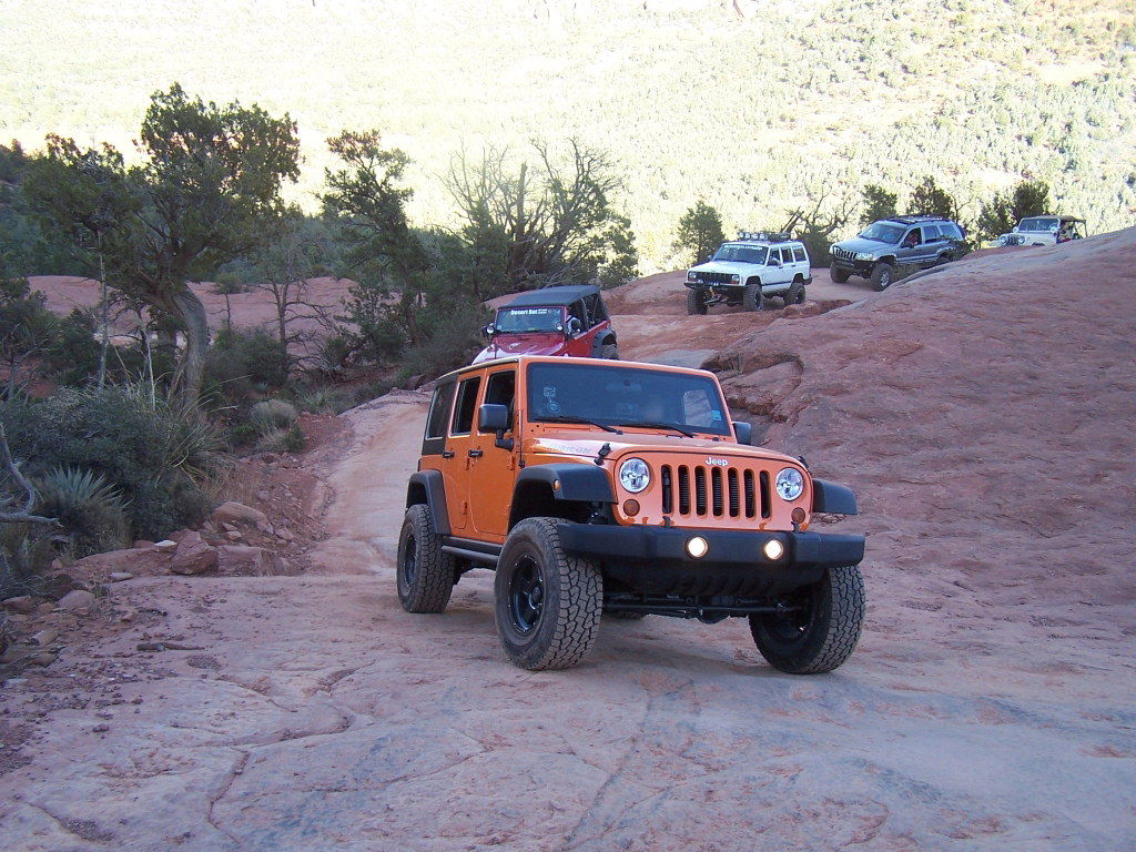Description: Although fairly short, this trail has to be considered one of the best in Arizona. It is extremely fun to drive and the red rock scenery is knock-out beautiful. This is an extremely popular route and traffic can be very heavy at times. Pull-outs are provided. Most of the trail runs through forest and is very narrow. Do not widen the trail by trying to pull over anywhere other than the pull-outs. You may have to back up. Please follow the arrows clearly posted right before one-way sections of the trail. This is also a very popular hiking and mountain biking area, so be alert and courteous at all times. Several large rock ledges require high ground clearance but the obstacles are not overwhelming because little articulation is required. Less than a mile into the trail, right after a parking area, there is a “go-no-go” rock you have to climb. If you can’t make it, it means your vehicle has no business being on the trail. There are few optional fun obstacles on the way back – you can skip them if you’re not comfortable. The hardest obstacle is called “The Steps”, which is driven downhill (no bypass). This obstacle is very steep and will be intimidating to an inexperienced driver, however stock SUVs with high ground clearance should be able get down just fine. Just take it slow. You may scrape bottom so skid plates are recommended. This trail is very well marked and easy to follow.