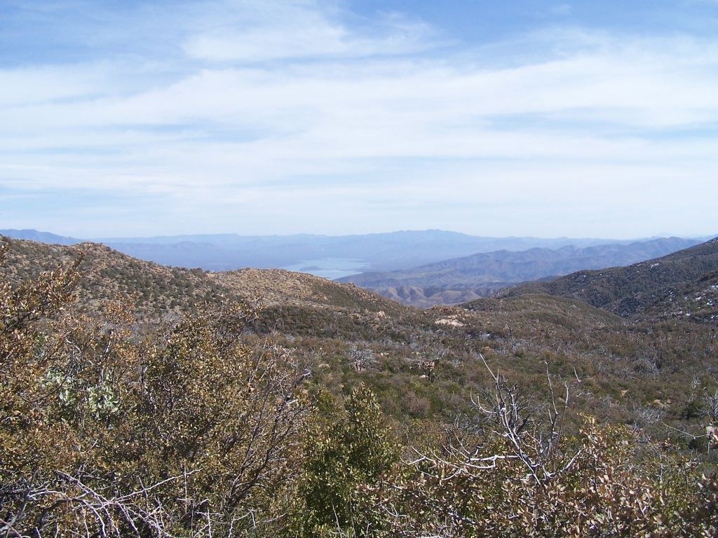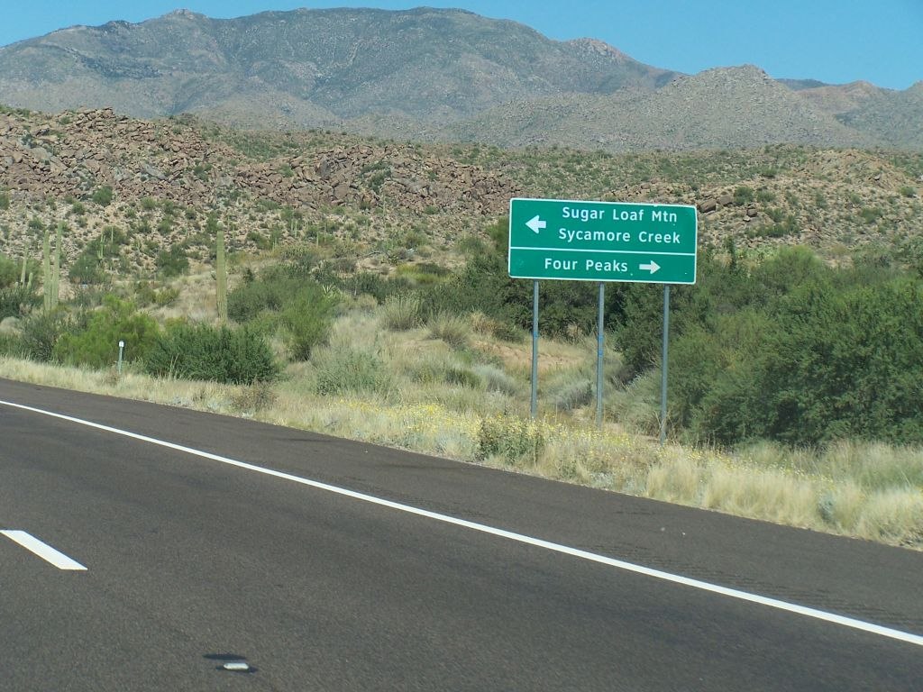 If you want to go all the way to the top of Four Peaks (well, not exactly, only to the trailhead parking area, from which you can hike up the mountain) follow FS 143. Ignore many small side roads. Bear left at 14.3 miles. Small water crossing possible at 10.1 miles. Bear right at 10.6. Continue past Cline Hiking Trailhead at 11.1 miles. Climb over ridge as Four Peaks comes back into view. Bear right after small stream at 13.7 miles (may be dry). Continue straight past Mud Spring Trailhead at 15.3. Reach highest point of the trail at 18.2 miles. FS 648 goes right to hiking trailhead to Four Peaks Wilderness.