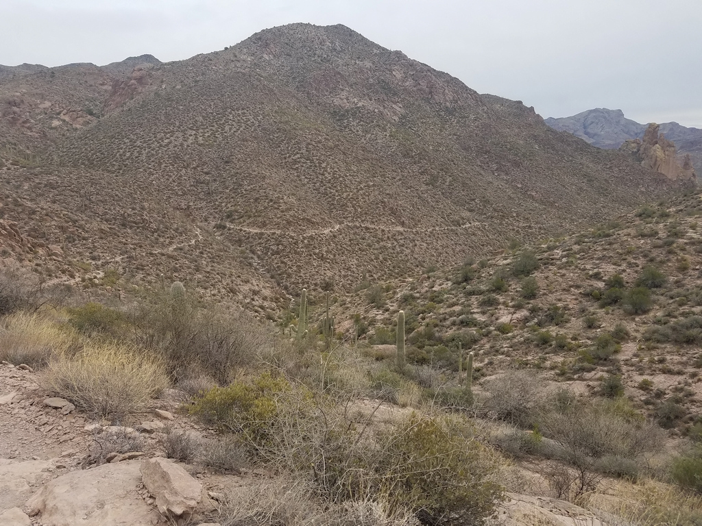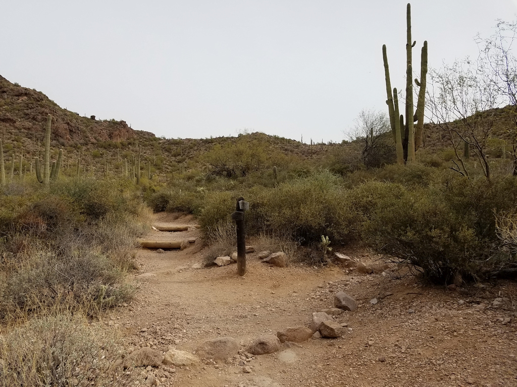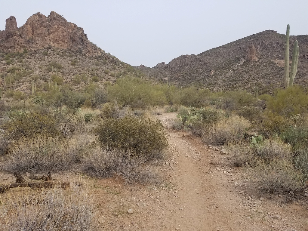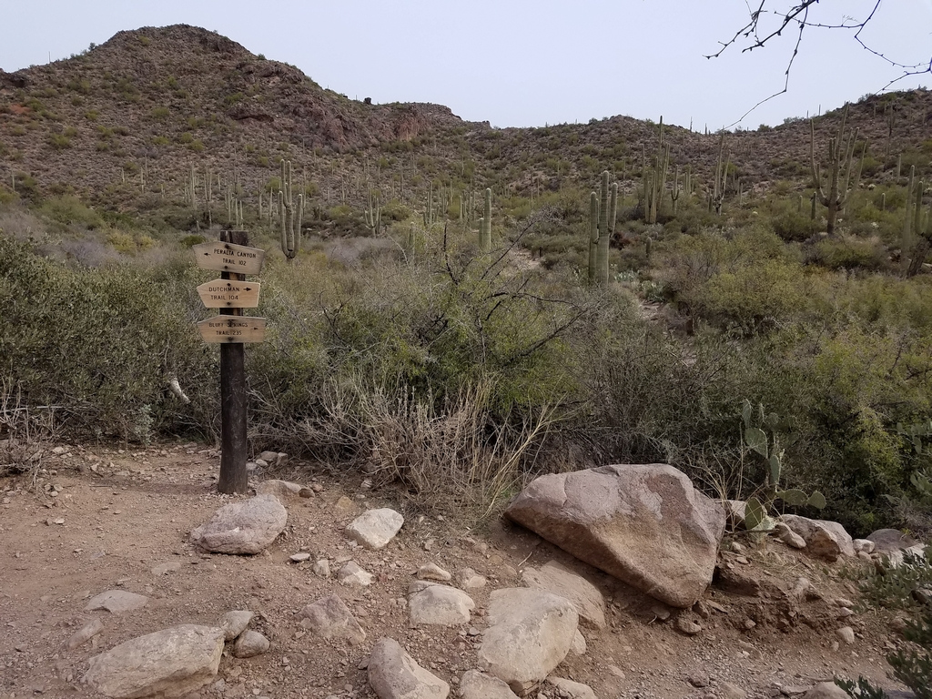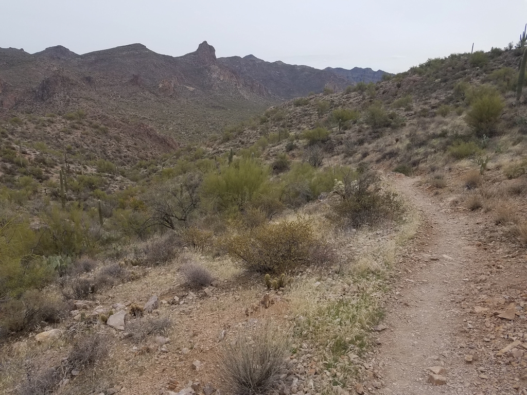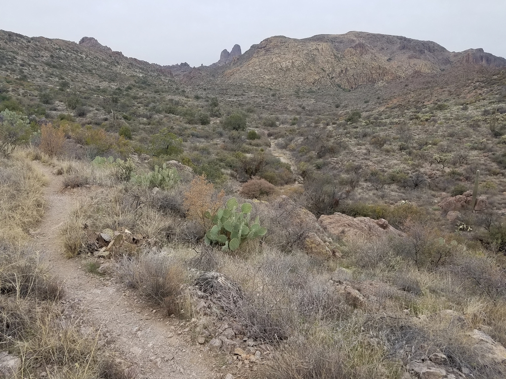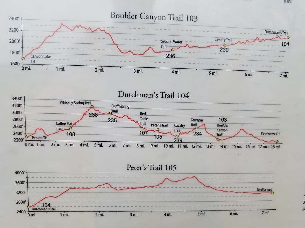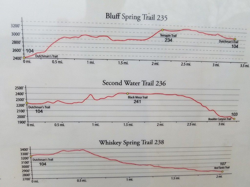 From the Peralta trailhead, head out east following the Dutchman’s Trail #104. After passing the beginning hills the trail drops down into Barkley Basin. It’s a scenic hike across. Passing the junction with Coffee Flat Trail #108, Dutchman’s Trail starts to switchback and climb. Once you make it through the five or six switchbacks you start heading northwest. Soon you will pass the right (east) side of Miners Needle. Passing the north end (keep looking up) you have a great view through the “eye of the needle”. The eye is small so don’t get too excited. The trail makes a quarter circle around Miners Needle then heads north again. Shortly you come to the junction with Whiskey Spring Trail #238 at about four and a quarter miles. Continue on the Dutchman’s Trail down to its intersection with Bluff Spring Trail #235 at seasonal Crystal Spring. Take Bluff Spring Trail west to the junction with Terrapin Trail #234. To complete Miners Needle Loop, head back by continuing on the Bluff Spring Trail to the trailhead and parking lot, which is 2.3 miles away from this trail intersection.