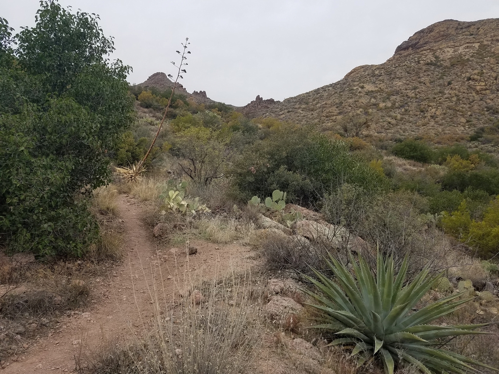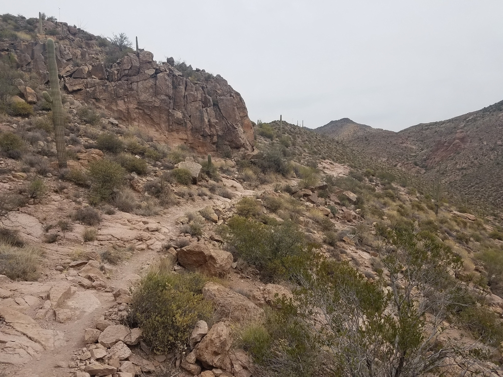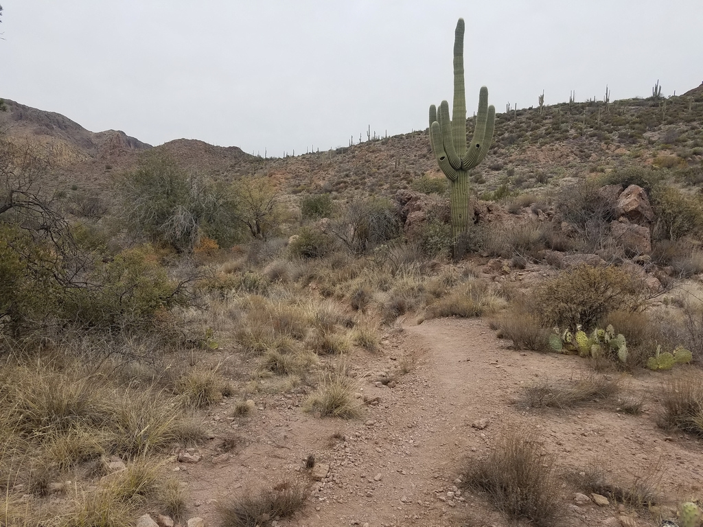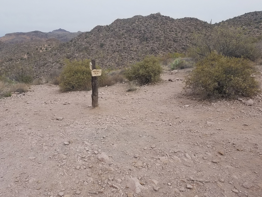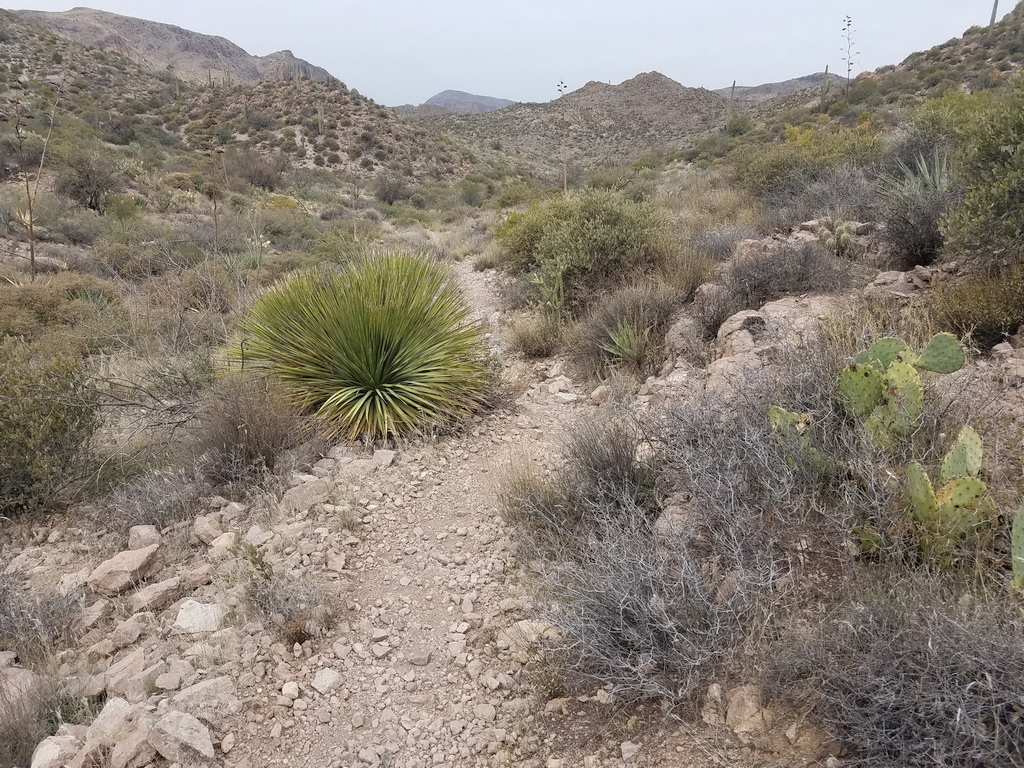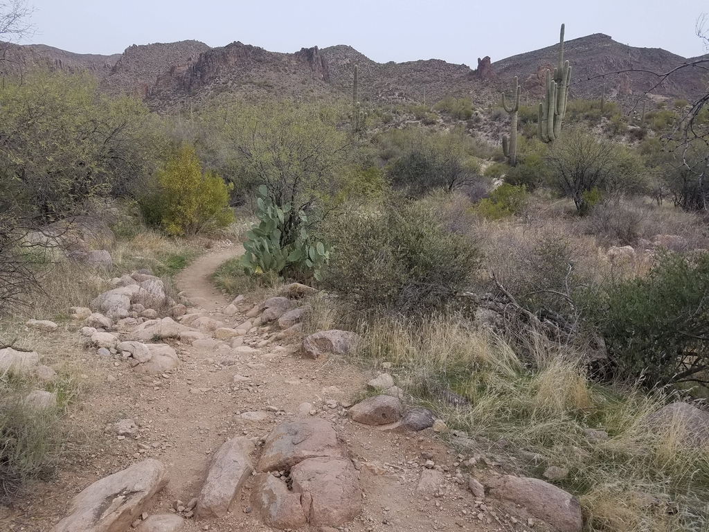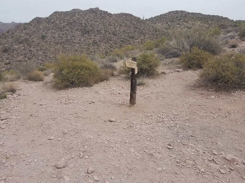 From the Peralta trailhead, head out east following the Dutchman’s Trail #104. After passing the beginning hills the trail drops down into Barkley Basin. It’s a scenic hike across. Passing the junction with Coffee Flat Trail #108, Dutchman’s Trail starts to switchback and climb. Once you make it through the five or six switchbacks you start heading northwest. Soon you will pass the right (east) side of Miners Needle. Passing the north end (keep looking up) you have a great view through the “eye of the needle”. The eye is small so don’t get too excited. The trail makes a quarter circle around Miners Needle then heads north again. Shortly you come to the junction with Whiskey Spring Trail #238 at about four and a quarter miles. Continue on the Dutchman’s Trail down to its intersection with Bluff Spring Trail #235 at seasonal Crystal Spring. Take Bluff Spring Trail west to the junction with Terrapin Trail #234. To complete Miners Needle Loop, head back by continuing on the Bluff Spring Trail to the trailhead and parking lot, which is 2.3 miles away from this trail intersection.