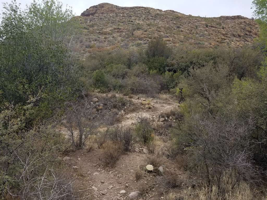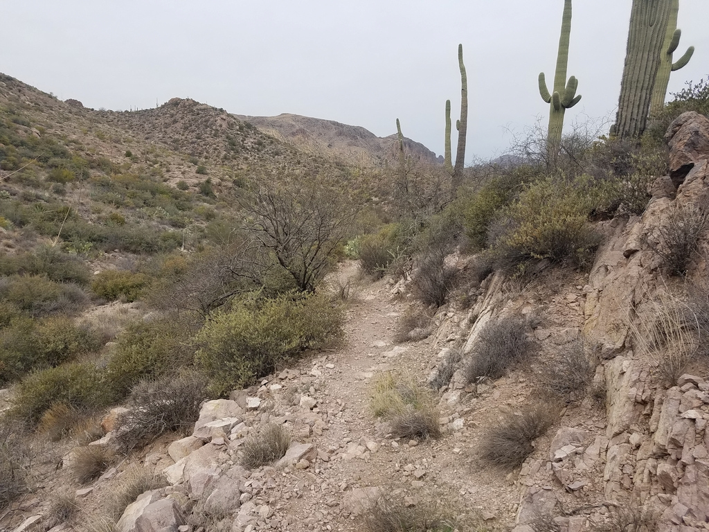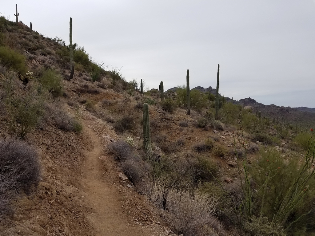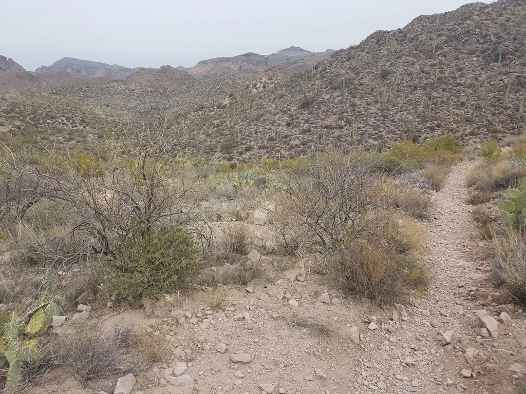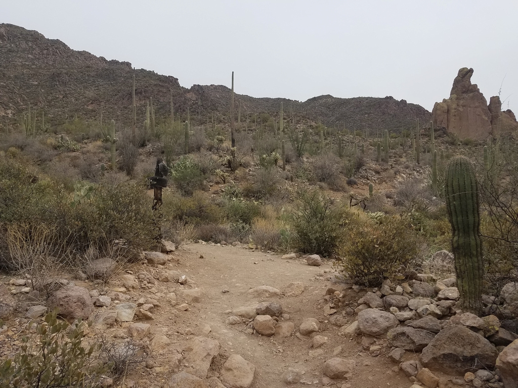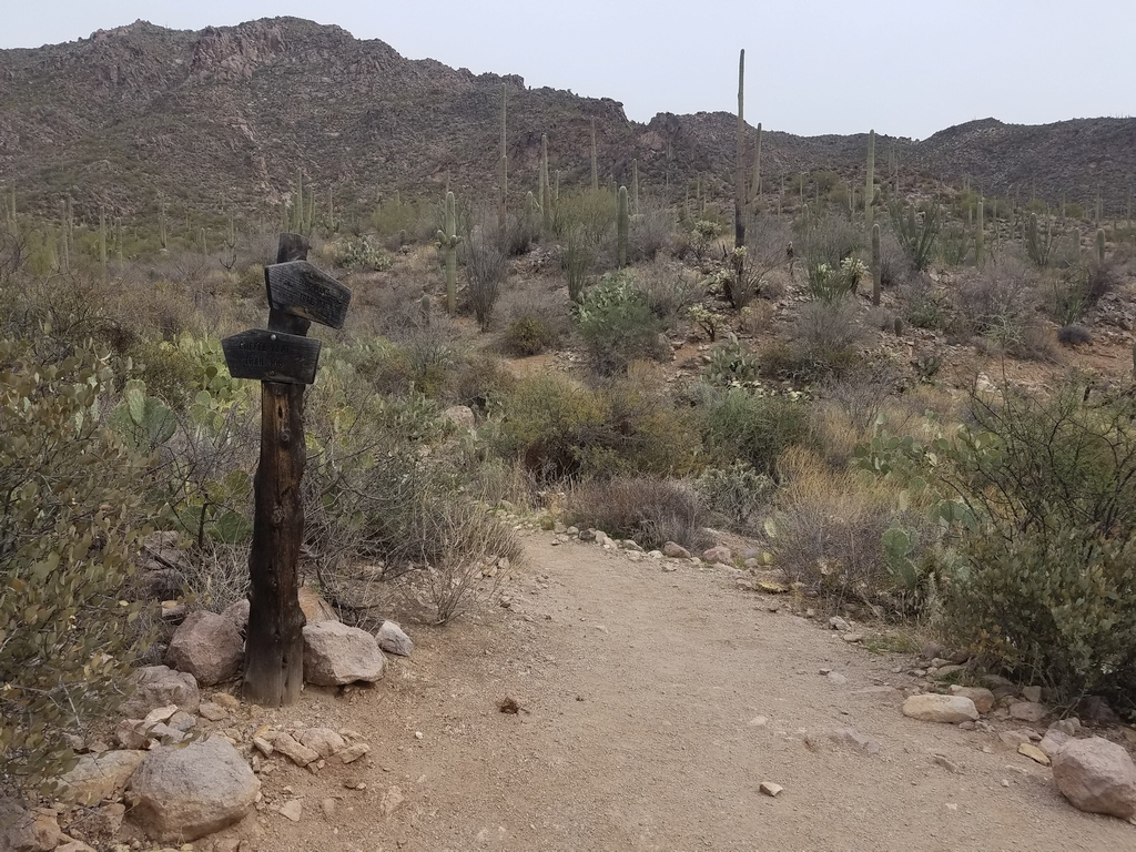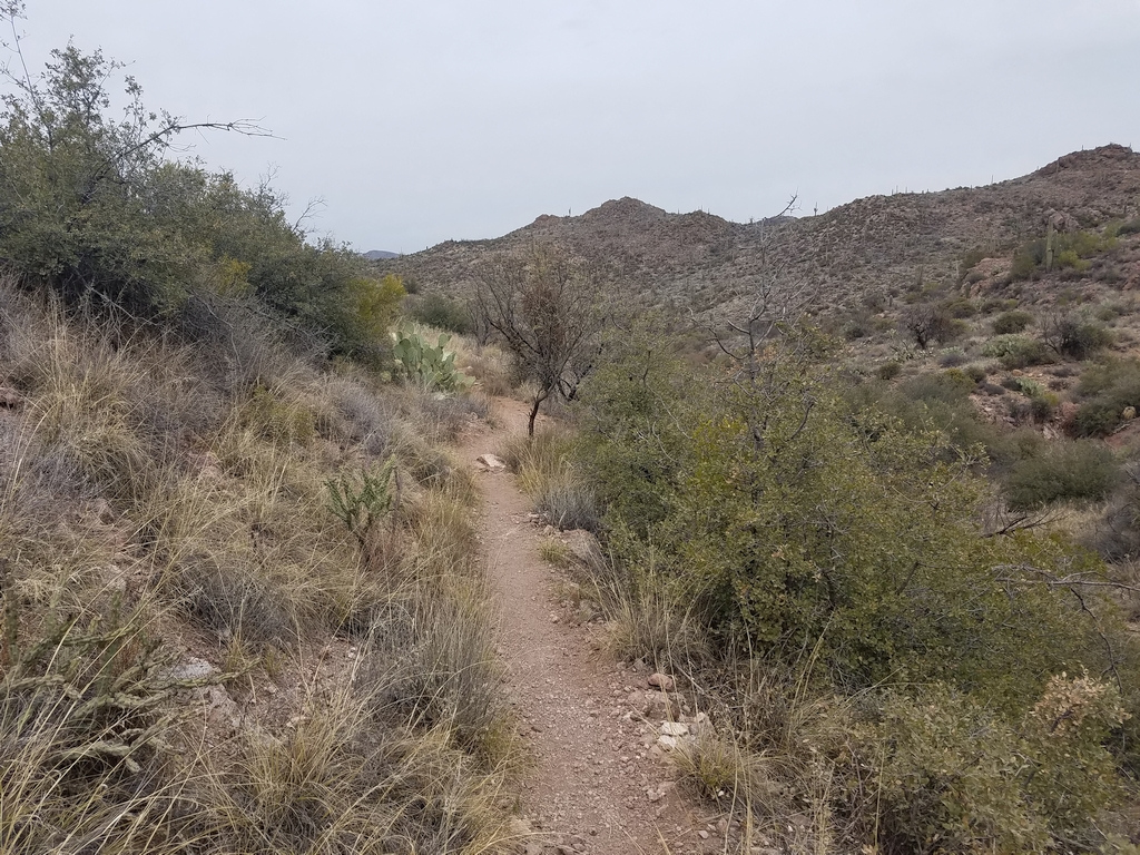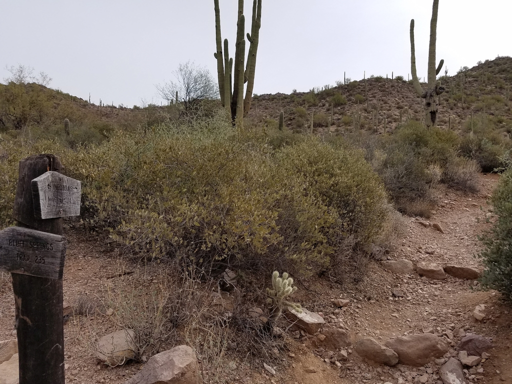 From the Peralta trailhead, head out east following the Dutchman’s Trail #104. After passing the beginning hills the trail drops down into Barkley Basin. It’s a scenic hike across. Passing the junction with Coffee Flat Trail #108, Dutchman’s Trail starts to switchback and climb. Once you make it through the five or six switchbacks you start heading northwest. Soon you will pass the right (east) side of Miners Needle. Passing the north end (keep looking up) you have a great view through the “eye of the needle”. The eye is small so don’t get too excited. The trail makes a quarter circle around Miners Needle then heads north again. Shortly you come to the junction with Whiskey Spring Trail #238 at about four and a quarter miles. Continue on the Dutchman’s Trail down to its intersection with Bluff Spring Trail #235 at seasonal Crystal Spring. Take Bluff Spring Trail west to the junction with Terrapin Trail #234. To complete Miners Needle Loop, head back by continuing on the Bluff Spring Trail to the trailhead and parking lot, which is 2.3 miles away from this trail intersection.