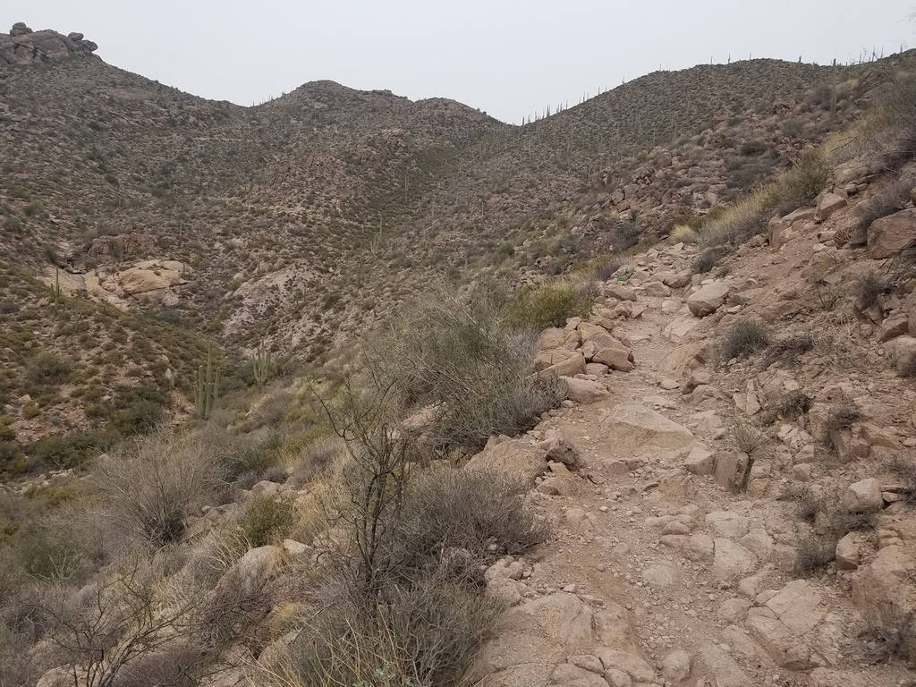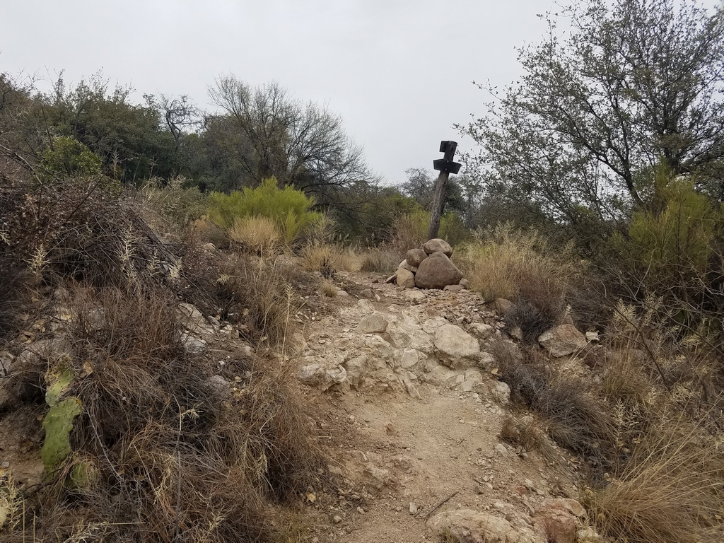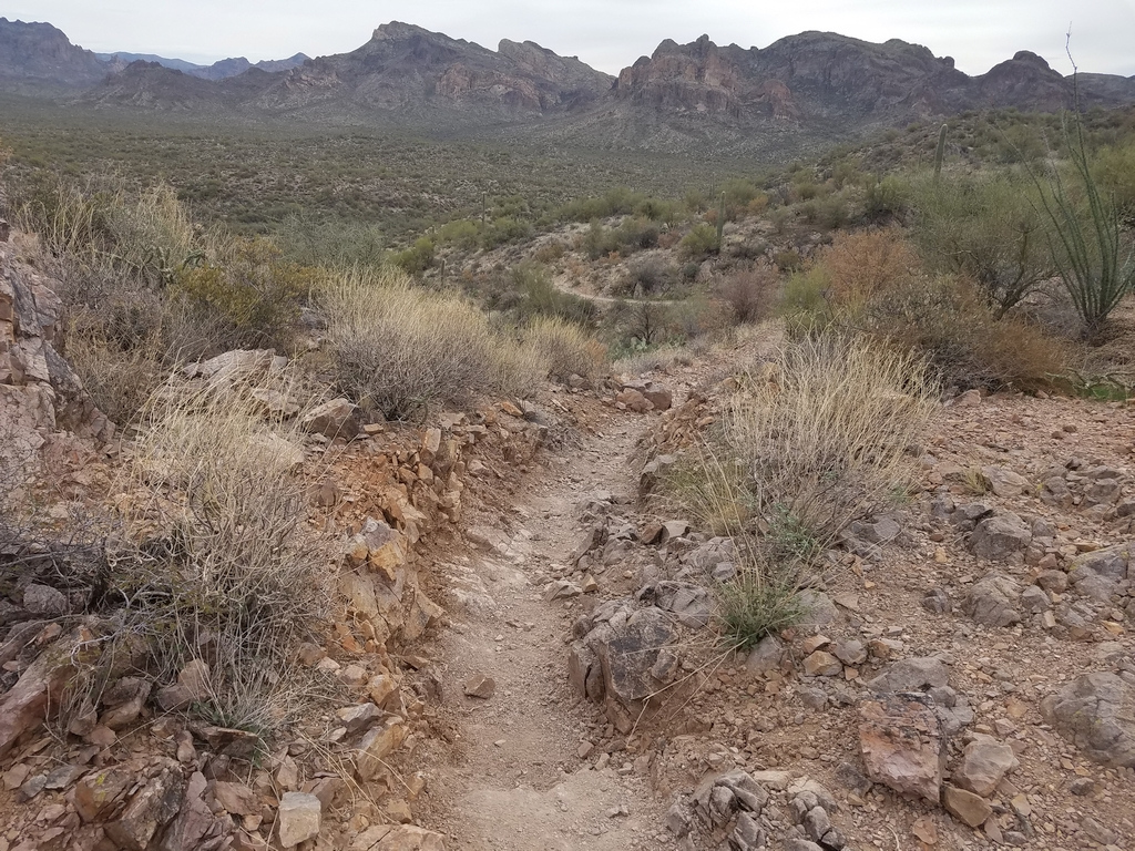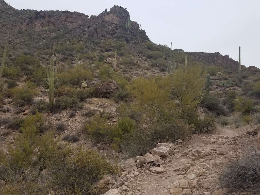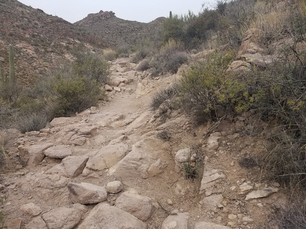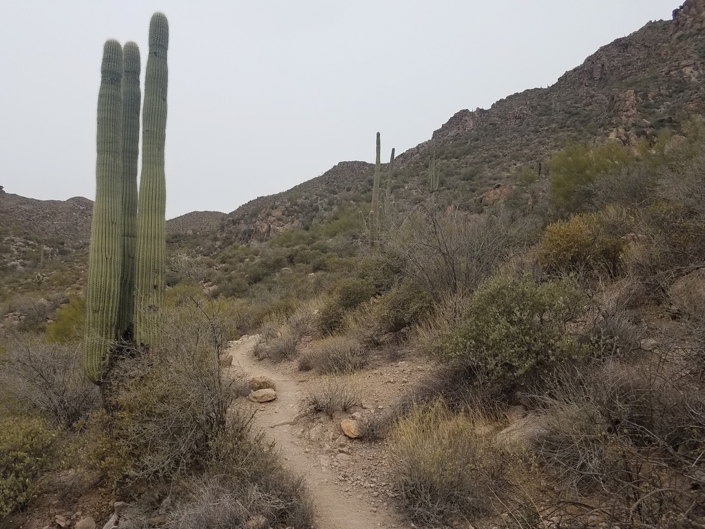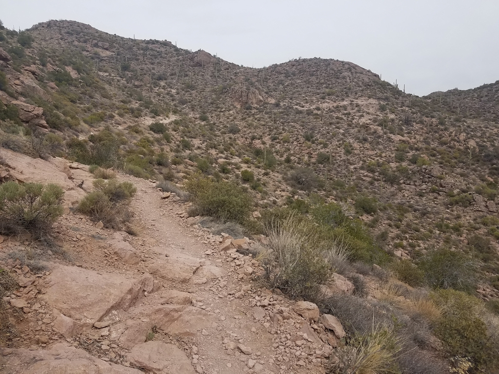 From the Peralta trailhead, head out east following the Dutchman’s Trail #104. After passing the beginning hills the trail drops down into Barkley Basin. It’s a scenic hike across. Passing the junction with Coffee Flat Trail #108, Dutchman’s Trail starts to switchback and climb. Once you make it through the five or six switchbacks you start heading northwest. Soon you will pass the right (east) side of Miners Needle. Passing the north end (keep looking up) you have a great view through the “eye of the needle”. The eye is small so don’t get too excited. The trail makes a quarter circle around Miners Needle then heads north again. Shortly you come to the junction with Whiskey Spring Trail #238 at about four and a quarter miles. Continue on the Dutchman’s Trail down to its intersection with Bluff Spring Trail #235 at seasonal Crystal Spring. Take Bluff Spring Trail west to the junction with Terrapin Trail #234. To complete Miners Needle Loop, head back by continuing on the Bluff Spring Trail to the trailhead and parking lot, which is 2.3 miles away from this trail intersection.
