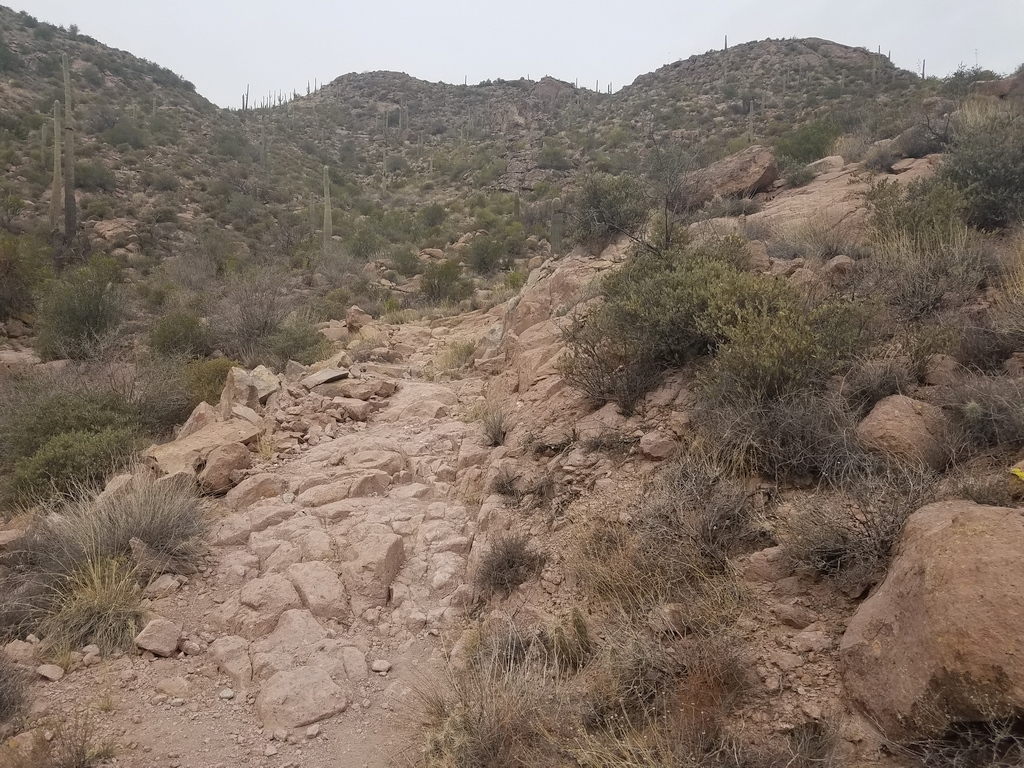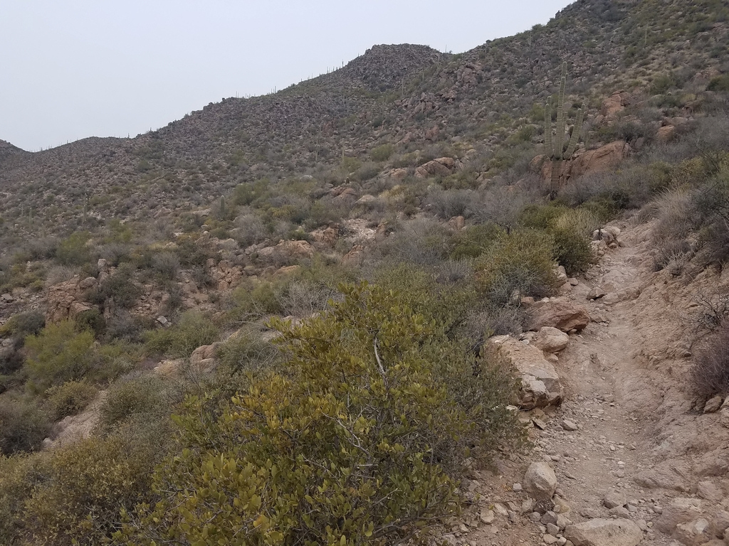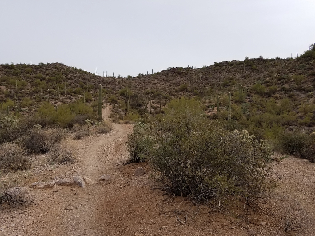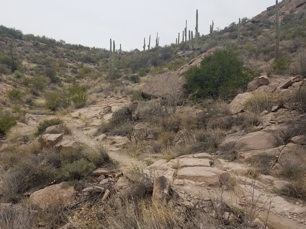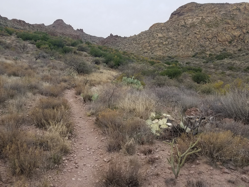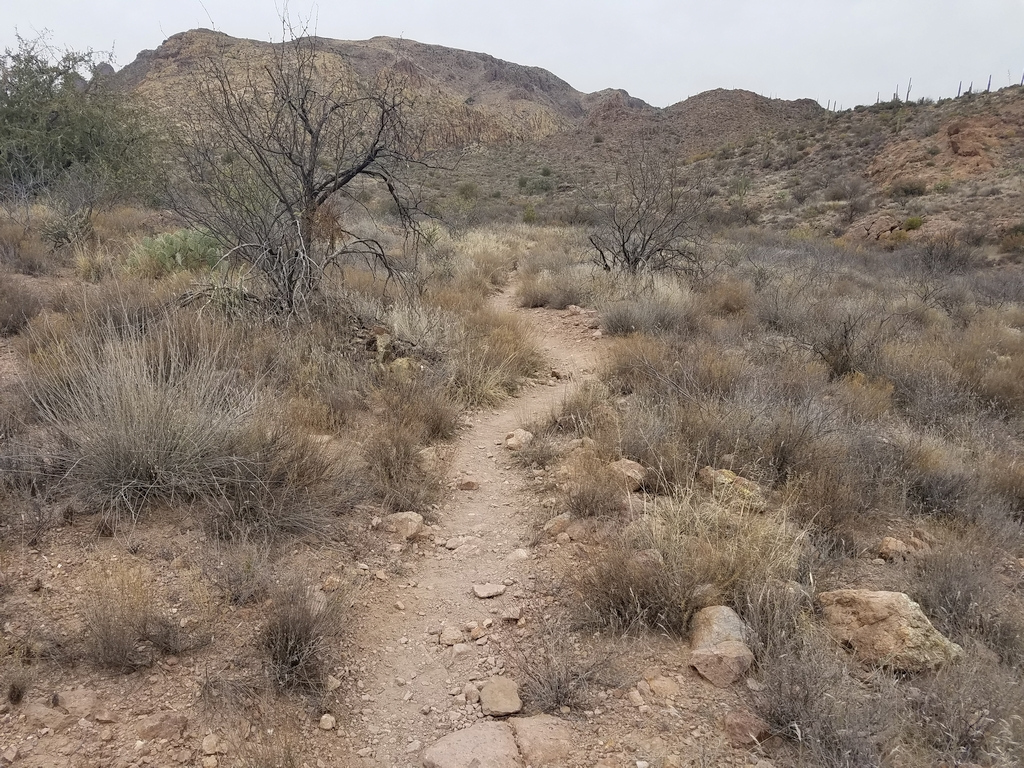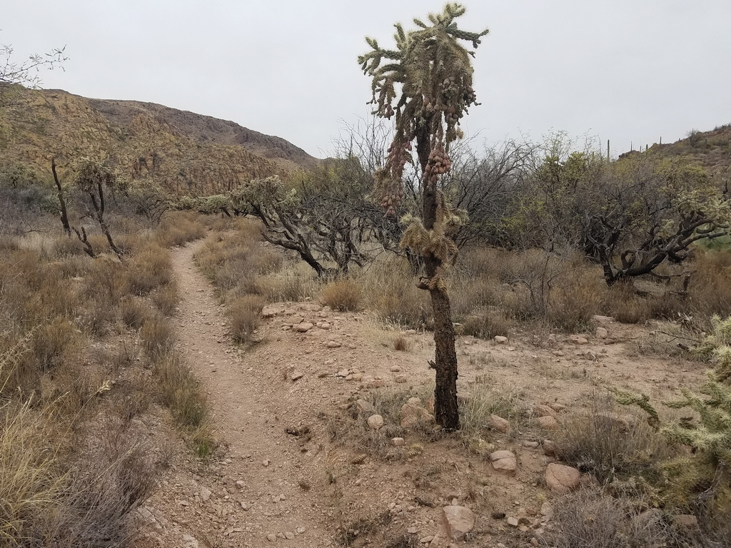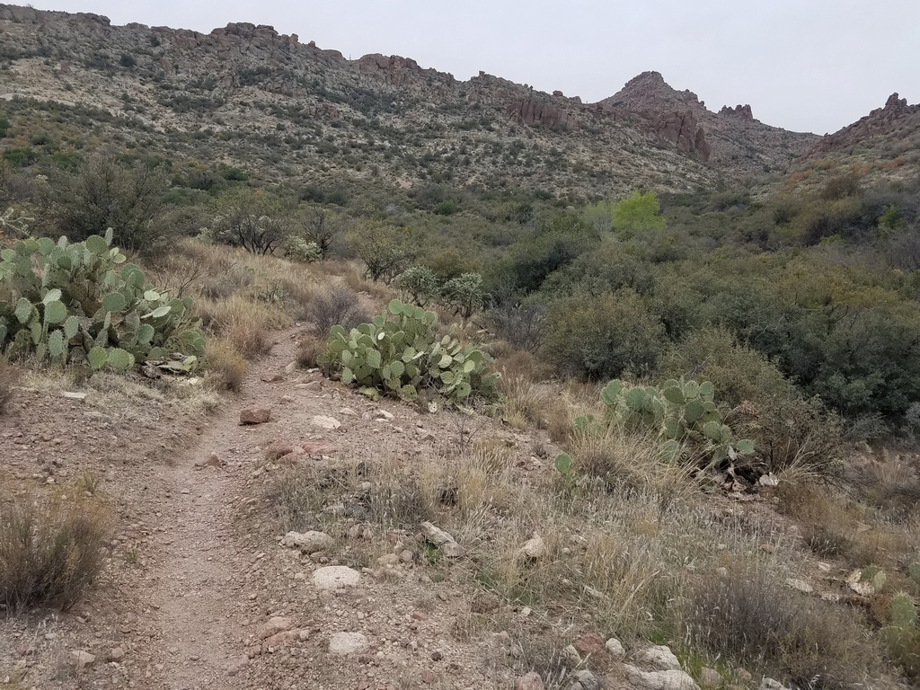 From the Peralta trailhead, head out east following the Dutchman’s Trail #104. After passing the beginning hills the trail drops down into Barkley Basin. It’s a scenic hike across. Passing the junction with Coffee Flat Trail #108, Dutchman’s Trail starts to switchback and climb. Once you make it through the five or six switchbacks you start heading northwest. Soon you will pass the right (east) side of Miners Needle. Passing the north end (keep looking up) you have a great view through the “eye of the needle”. The eye is small so don’t get too excited. The trail makes a quarter circle around Miners Needle then heads north again. Shortly you come to the junction with Whiskey Spring Trail #238 at about four and a quarter miles. Continue on the Dutchman’s Trail down to its intersection with Bluff Spring Trail #235 at seasonal Crystal Spring. Take Bluff Spring Trail west to the junction with Terrapin Trail #234. To complete Miners Needle Loop, head back by continuing on the Bluff Spring Trail to the trailhead and parking lot, which is 2.3 miles away from this trail intersection.