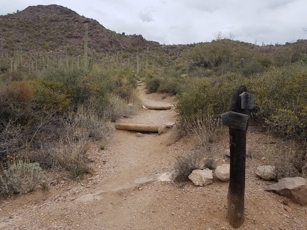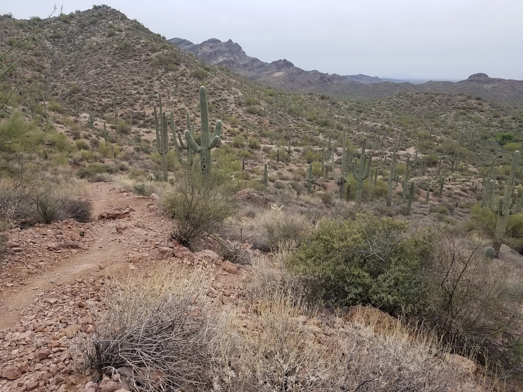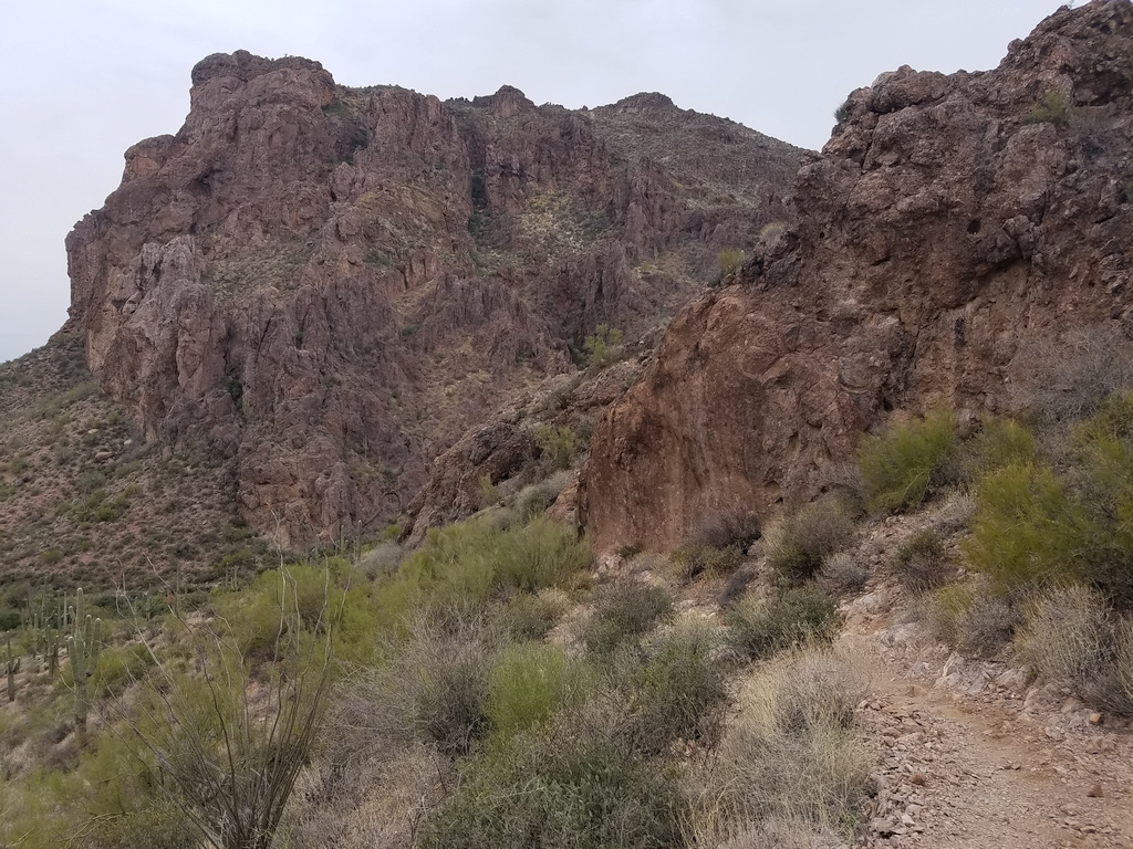 From the Peralta trailhead, head out east following the Dutchman’s Trail #104. After passing the beginning hills the trail drops down into Barkley Basin. It’s a scenic hike across. Passing the junction with Coffee Flat Trail #108, Dutchman’s Trail starts to switchback and climb. Once you make it through the five or six switchbacks you start heading northwest. Soon you will pass the right (east) side of Miners Needle. Passing the north end (keep looking up) you have a great view through the “eye of the needle”. The eye is small so don’t get too excited. The trail makes a quarter circle around Miners Needle then heads north again. Shortly you come to the junction with Whiskey Spring Trail #238 at about four and a quarter miles. Continue on the Dutchman’s Trail down to its intersection with Bluff Spring Trail #235 at seasonal Crystal Spring. Take Bluff Spring Trail west to the junction with Terrapin Trail #234. To complete Miners Needle Loop, head back by continuing on the Bluff Spring Trail to the trailhead and parking lot, which is 2.3 miles away from this trail intersection.
